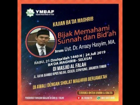 [KBM #166]: Ust. Dr. Arrazi Hasyim, M.A. - "Bijak Memahami Sunnah Dan Bid';ah"'s Video dari Al-Falah TV berdurasi 1:43:51 dan telah di tonton sebanyak 2635 dan masih bisa bertambah.